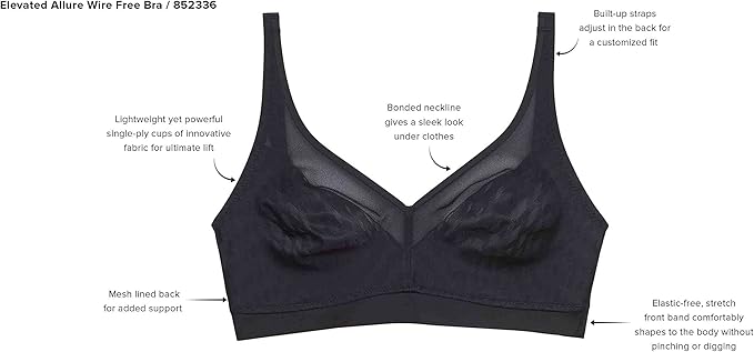 Lightweight yet powerful cups lift the bustline up to one inch while the elastic-free, stretch front band contours to your body so it never pinches or restrains.
